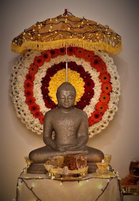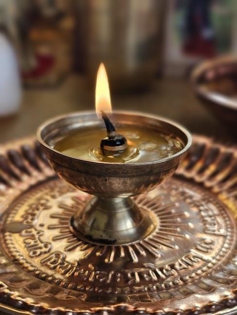 The altar, facing east or north, is central. The Satyanarayana Pooja PDF often includes diagrams illustrating the placement of Lord Satyanarayana’s idol or image. It details arranging offerings – fruits, flowers, sweets – neatly on the altar.